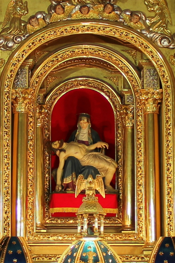 Figura Matki Bożej Bolesnej - Pieta sprowadzona po rozbudowie kościoła w 1880 z monachium (minchen) albo z bawarii (umieszczona początkowo w bocznej kaplicy gdzie umieszczony jest zrąb pierwotnego ołtarza)