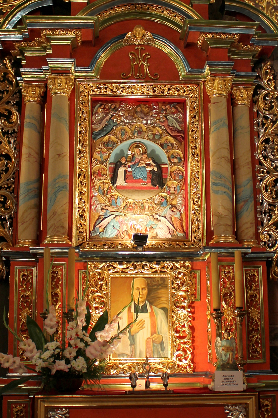 | Boczny ołtarz - poniżej obraz ukazujący bł. Jana Wojciecha Balickiego beatyfikowanego w czasie ostatniej pielgrzymki w Krakowie na błoniach przez Jana Pawła II. Powyżej płaskorzeźba wykonana przez Józefa Aszklara ukazująca przekazanie różańca św. Dominikowi i 15 tajemnic różańcowych |
