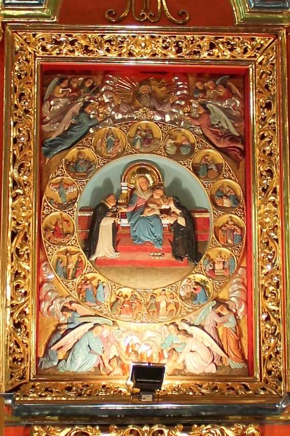 Boczny ołtarz - płaskorzeźba wykonana przez Józefa Aszklara ukazująca przekazanie różańca św. Dominikowi i 15 tajemnic różańcowych